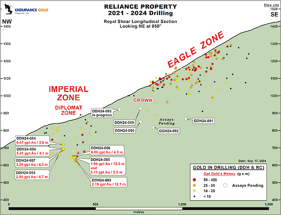 “The Reliance Gold Project continues to deliver exciting drill results that demonstrate a strong gold system. The current drilling is expanding the Imperial, Eagle, Crown and Diplomat zones hosted within the 2-km long Royal Shear” stated Robert T. Boyd, CEO of Endurance Gold Corporation. “Assay results from these step-out holes indicate that the gold system is still open to expansion along strike and to depth. We look forward to additional results as we test the northwest extensions of the Eagle Zone and the undrilled gap between Eagle and Imperial that includes the Crown Zone”.