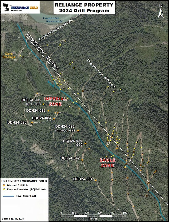 Endurance Gold Corporation (EDG – TSX.V; ENDGF – OTC Pink; 3EG – Berlin Open Market) (the “Company”) is pleased to announce preliminary assay results from the first six (6) diamond drill holes completed in the Imperial and Diplomat Zones at its Reliance Gold Project. The planned 2024 drilling program consists of up to 10,000 metres (“m”) of diamond drilling designed to expand the gold zones discovered within the 2-km long Royal Shear structure. To date, eleven (11) drill holes have been completed for over 3,500 m.