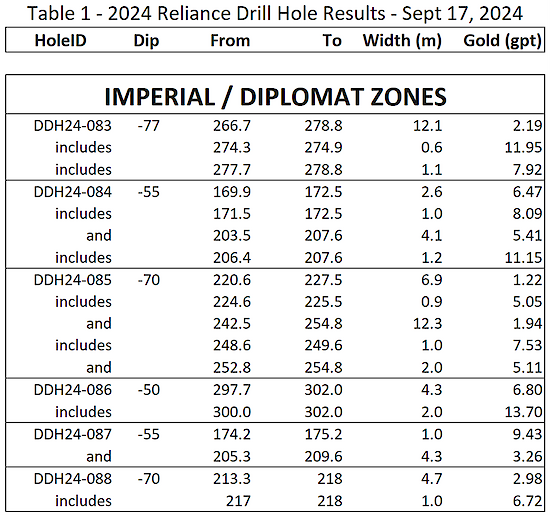 Table 1 – 2024 Reliance Drill Hole Results – September 17, 2024