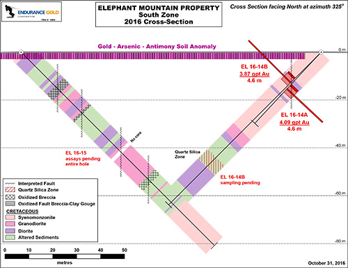 Endurance Gold Corporation (EDG -- TSX.V, "Endurance") is pleased to announce the first assay results from the 2016 drill program on its 100% optioned Elephant Mountain Gold Property (the "Property") in Alaska located on roads about 76 miles (123 kilometres) northwest of Fairbanks. As announced on September 27, 2016 three (3) diamond drill holes were completed on the South Zone and one diamond drill hole was completed on the North Zone for a total of 598 metres drilled. Complete assays for the 2016 drilling are still pending however assays results were prioritized for drill holes EL 16-14 A&B which intersected an altered zone with areas of massive stibnite and arsenopyrite at the South Zone Soil Anomaly.