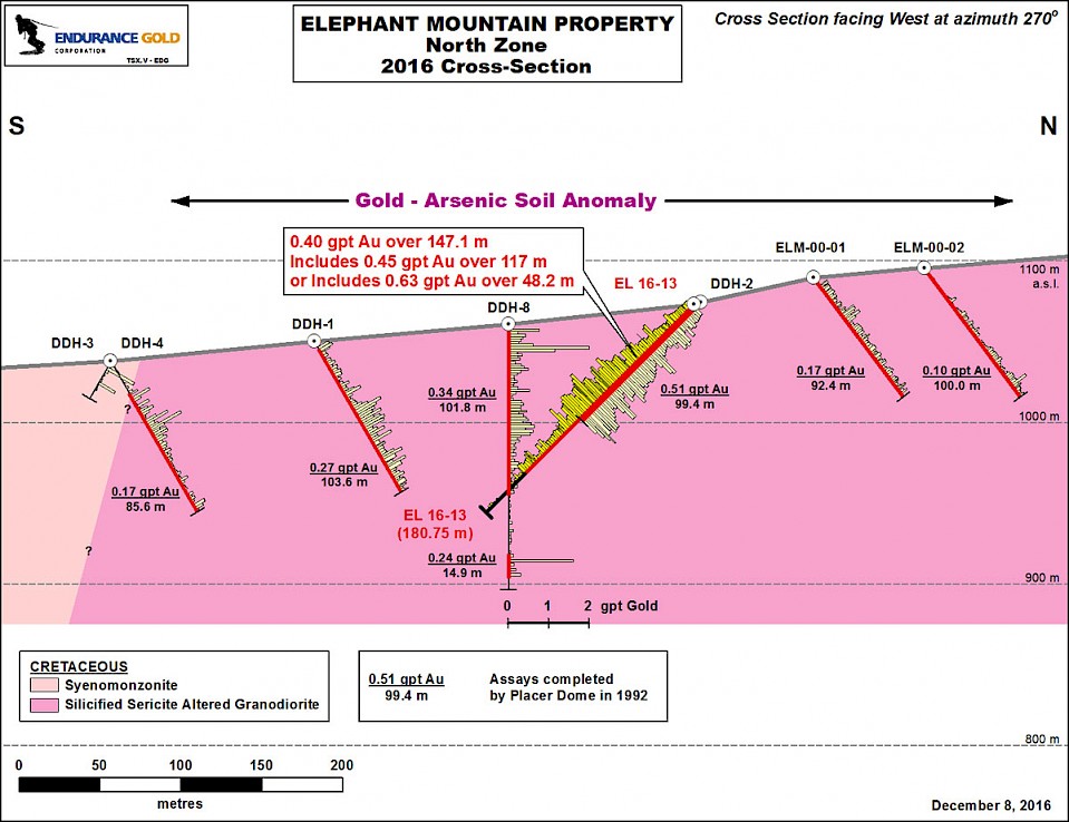 Endurance completed one diamond drill hole EL 16-13 (Az 180 Dip-45) which tested the slightly higher grade core of the prior drill section within this broad low-grade zone. EL 16-13 was drilled to a total angled depth of 180.75 m and encountered silicified and phylllic (sericite) altered granodiorite throughout the entire core length. About 150 m of this length, starting at surface, encountered up to 1.5% pervasive disseminated pyrite and arsenopyrite with arsenopyrite and pyrite bearing quartz veinlets. The entire length of the drill hole is in-part oxidized with the oxidation related to fractures and oxidized quartz-sulphide veinlets. Assay results are 0.40 gpt Au over 147.1 m including a 0.63 gpt Au over 48.2 m. True width is currently unknown although correlation of the greater than 0.50 gpt gold mineralization for the North Zone drill section shows an apparent sub-horizontal orientation. A PDI drill hole located at approximately the same location as EL 16-13 returned an average grade of 0.514 gpt Au over an interval of 99.4 m.