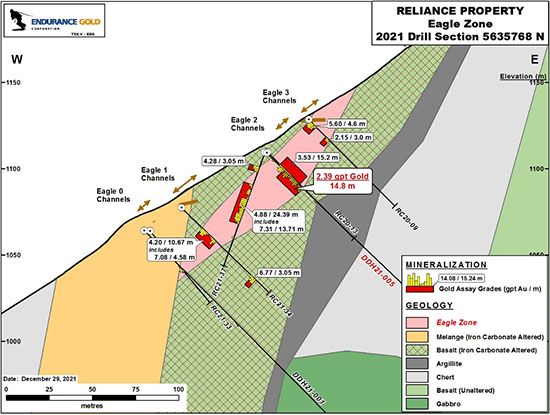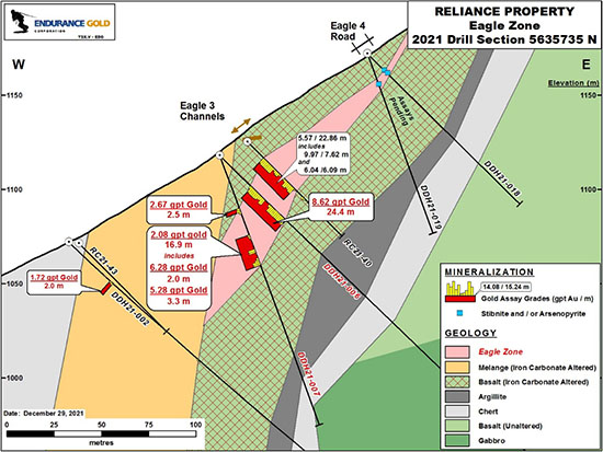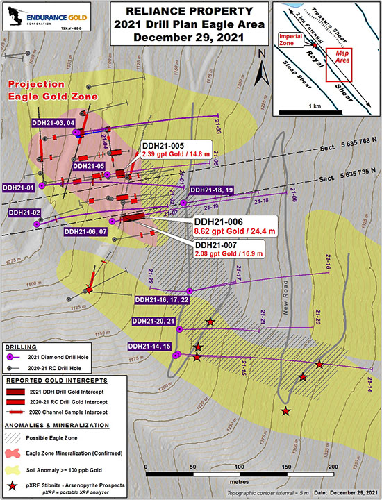 "We are pleased to see the Eagle Zone continue to deliver high-grade intervals over substantial widths as we expand the extent of this zone", commented Robert T. Boyd, CEO of Endurance Gold. "We have now delivered both RC and diamond drill gold intercepts that confirm a significant strike length at the Eagle Zone. We look forward to expanding that strike potential even further with pending results. With other high grade intersections, such as Imperial and Diplomat, our 2021 exploration program has already delivered a minimum 1.5 kilometre of exploration potential at the Reliance Property."