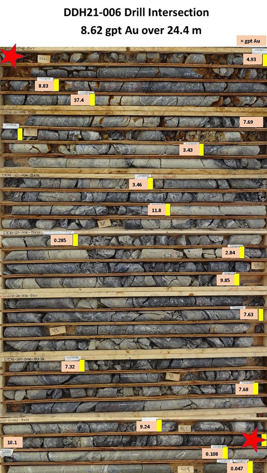 - DDH21-006 intersected gold mineralization of 8.62 grams per tonne ("gpt") gold over 24.4 metres ("m") (est. true width) including 17.02 gpt gold over 4.3 m. The gold mineralized interval commenced at 25.6 m down hole.