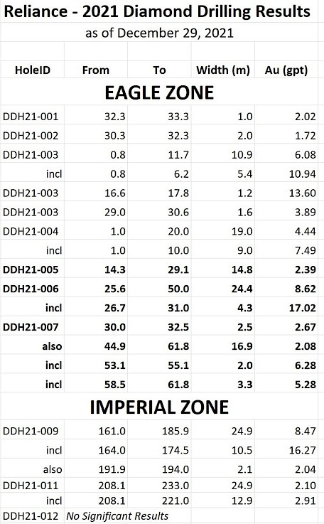 As announced on on November 3, 2021, the Company completed twenty-two (22) drill holes at the Eagle and Imperial Zones. Assay results for the first four (4) of sixteen (16) holes completed at the Eagle Zone were reported on on November 29, 2021 with intersections of 10.94 gpt gold over 5.4 m and 7.49 gpt gold over 9.0 m. Assay results for three (3) of six (6) holes drilled at the Imperial Zone were reported on on December 9, 2021 with a highlight intersection of 8.47 gpt gold over 24.9 m including a higher grade core of 16.27 gpt gold over 10.5 m. The 2021 diamond drill results reported to date are summarized in Table 1 below. Assay results remain to be reported for an additional twelve (12) holes at Eagle and Imperial Zone with results expected to be reported through January and February 2022.
