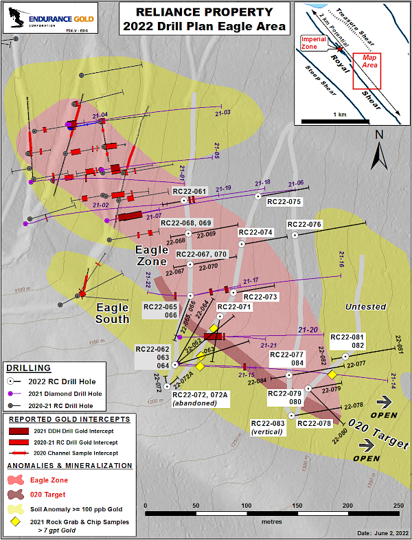- Thirty-three (33) RC drill holes have been completed in the spring RC drill program. Twenty-five (25) holes completed on the Eagle and Eagle South Targets, and as previously reported eight (8) holes completed along the Treasure structural trend.