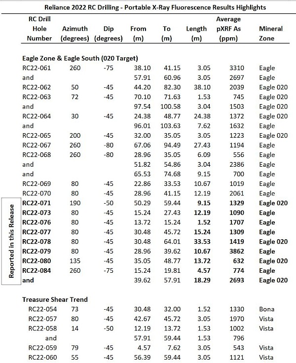 - Significant intersections, not previously reported, include 1,419 ppm pXRF As over 33.5 m in RC22-078, 3,862 ppm pXRF As over 10.67 m in RC22-079, 2,693 ppm pXRF As over 18.29 m in RC22-084, and 1,090 ppm pXRF As over 12.19 m in RC22-073.