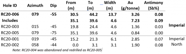Imperial North - Two holes were completed at Imperial North to test for gold mineralization below the outcrop channel samples that returned 6.7 m grading 3.14 gpt Au (see News Release November 23, 2020). Drill holes RC20-001 and RC20-002 intersected near-surface mineralization including 6.1 m of 2.85 gpt Au and 3.0 m of 1.9 gpt Au, respectively as shown on the plan map attached to this release. These results are insufficient to define the structural attitude of the Imperial North Zone nor the structural relationship with the higher grade Imperial Zone. Further work will be completed in the 2021 field season incorporating new ideas on geologic controls.