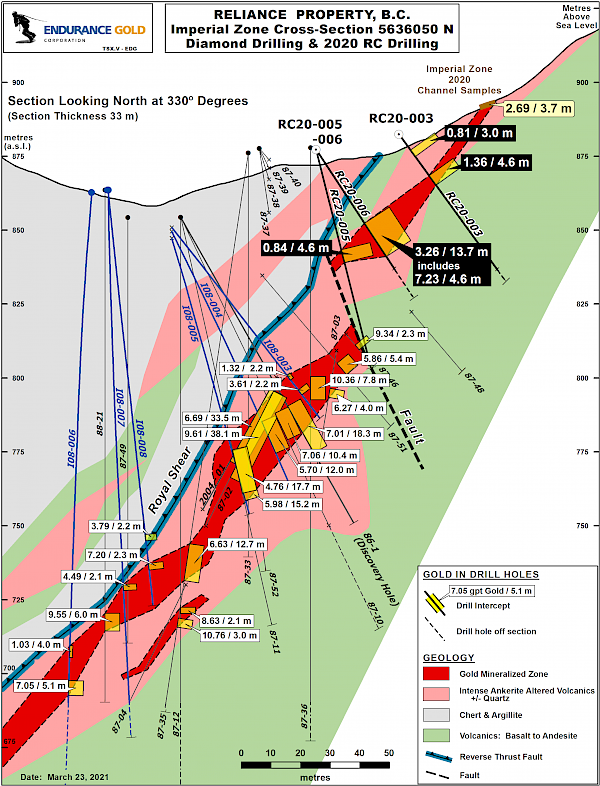 Imperial Zone - Drill hole RC20-006 intersected 13.7 metres (“m”) grading 3.26 gram per tonne gold (“gpt Au”) including a higher grade interval of 4.6 m grading 7.23 gpt Au. The hole successfully intersected mineralization within 30 m of surface and represents a 40 m up-dip expansion of the Imperial Zone as shown on Section 5636050N appended to this release. Geologic modelling indicates that the Imperial Zone has a down-dip extent of 290 m and open to expansion with a southwest plunge of -55 degrees. Historic drilling between 1986 and 2008 defined a higher-grade core of the mineralized zone with an approximately true width of 10 to 15 m. The strike extent of the Imperial Zone has been poorly constrained by drilling with very few intersections or testing along strike.
