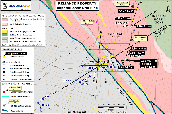 Endurance Gold Corporation (EDG – TSX.V) (the “Company”) is pleased to report assay results from the five (5) reverse circulation (“RC”) drill holes completed at the Imperial Zone of the Reliance Gold Property (the “Property”) in southern British Columbia. The Property is located 4 kilometres (“km”) east of the village of Gold Bridge with year-round road access, and 10 km north of the historic Bralorne-Pioneer Gold Mining Camp which has produced about 4 million ounces of gold. These five drill holes were planned to intersect near-surface gold mineralization of the Imperial Zone that was untested by historic drilling. The 2020 drill program also tested under the Imperial North Zone identified in 2020 channel sampling. Results are reported below.