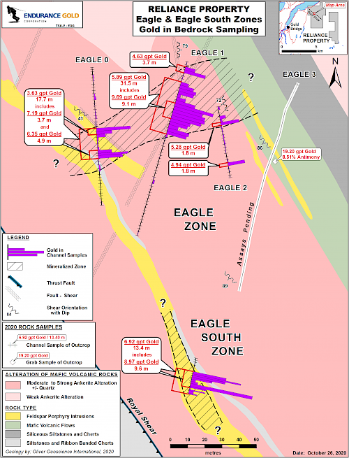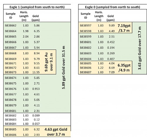 The reported 31.5 m Eagle 1 channel sample is approximately 135 m north of the Eagle South Zone which returned 6.92 gpt gold over 13.4 m with a higher grade portion of 8.9 gpt gold over 9.6 m (see Press Release dated October 15, 2020). Further work is required to determine how these zones relate to each other.