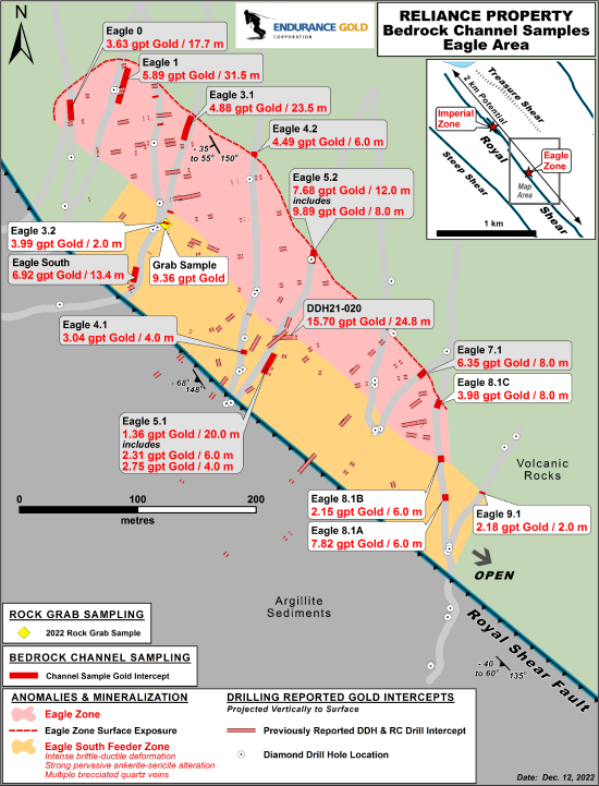 "Channel sampling has been an integral part of our ongoing exploration efforts at the Reliance Gold Project and was instrumental in the Eagle Zone discovery where our original channel sampling at Eagle returned 5.89 gpt gold over 31.5 metres and 4.88 gpt gold over 23.5 metres” commented Robert Boyd, CEO of Endurance Gold. “These additional channel sampling results, supported by our recent drill programs, have now delineated the Eagle Zone mineralization for over 530 metres. Our recently completed drilling program continues to expand the mineralized zones to depth and assay results are pending for 14 diamond drill holes in this area opened up with these channel sample results.”