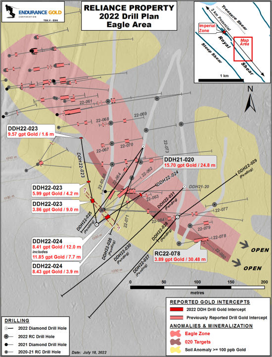 “Drilling at the Eagle area continues to deliver unexpected and encouraging surprises”, commented Robert T. Boyd, CEO of Endurance Gold. “These new wide intersections are located in the same structural setting as the steeper dipping Imperial Zone located over 750 metres northwest in the footwall of the Royal Shear Fault.”