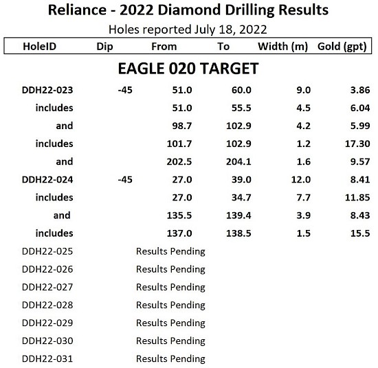 Assay results reported below are for the first two (2) diamond drill holes completed to test the Eagle 020 Target, a potential steep feeder structure for the shallow dipping Eagle Zone. Drill holes DDH22-023 and DDH22-024 intersected near-surface gold mineralization immediately on collaring in recoverable bedrock, locating a previously unrecognized gold mineralized structure that parallels the 020 Target.
