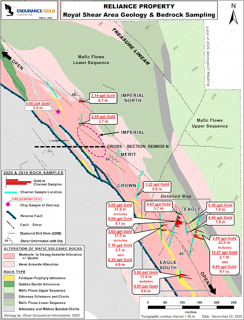 An updated map showing the summary geology together with the complete summary of the 2020 channel sample results along the 1,100 meters ("m") exposed portion of the altered Royal Shear is appended below and available on the Company website.