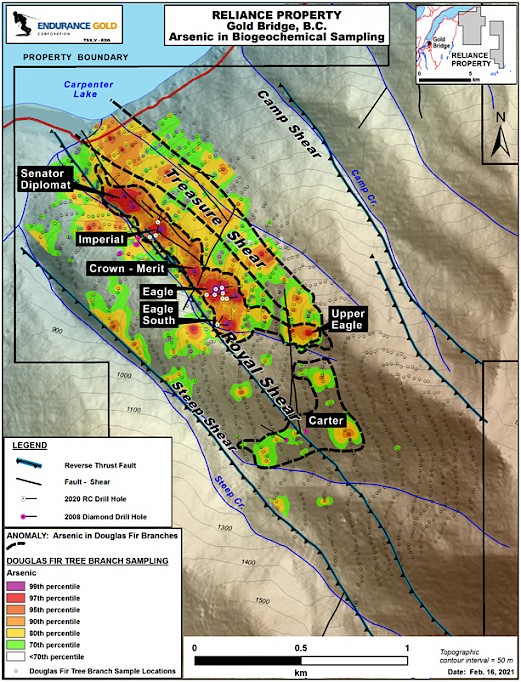 Endurance Gold Corporation (EDG -- TSX.V) (the “Company”) is pleased to report results from the biogeochemical survey completed during the 2020 field season at its Reliance Gold Property (the “Property”) in southern British Columbia. The Property is located 4 kilometres (“km”) east of the village of Gold Bridge with year-round road access, and 10 km north of the historic Bralorne-Pioneer Gold Mining Camp which has produced about 4 million ounces of gold. The 240-hectare biogeochemical survey was designed to test for blind mineralization obscured by the thick volcanic pumice tephra-ash that blankets the Property.