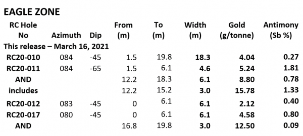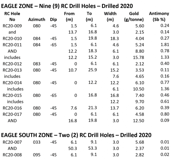 Eagle Zone - Hole RC20-017 intersected 6.1 m of 4.58 gpt Au and 3.0 m of 12.50 gpt Au starting at surface with the two mineralized intervals flanking an unmineralized feldspar porphyry dyke. Results from RC20-017 extends the wide zone of gold mineralization 42 m down-dip from previously released hole RC20-016 that intersected 13.7 m of 6.20 gpt Au (see News Release February 2, 2021). In this area the Eagle Zone remains open for expansion down-dip and along strike. RC20-017 was the only hole completed under the ‘Eagle 0’ channel samples that returned 17.7 m averaging 3.63 gpt Au (see News Release October 26, 2020).