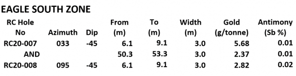 Eagle South Zone - Two holes were completed at the Eagle South Zone to test for gold mineralization below the outcrop channel samples that returned 13.4 m grading 6.92 gpt Au (see News Release October 15, 2020). Results are reported below.