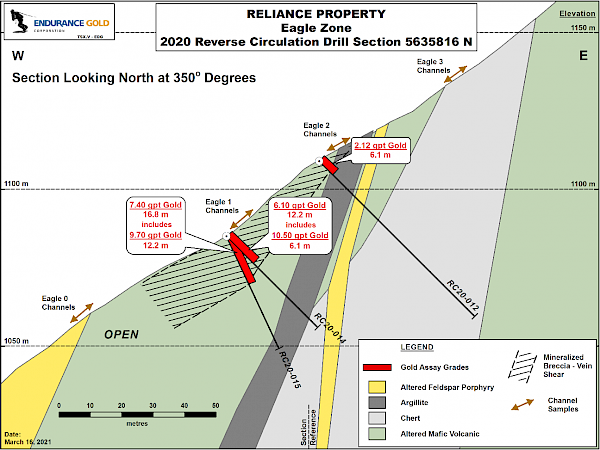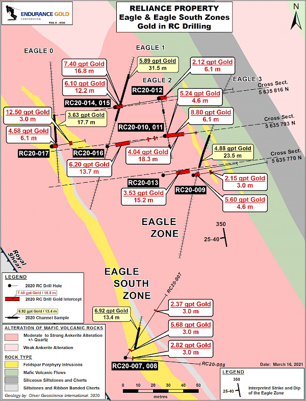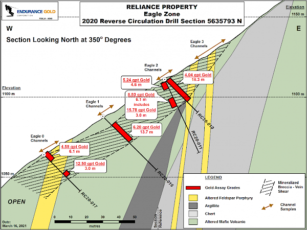 “Management is extremely encouraged with these initial results from the Eagle Zone where all nine shallow RC holes and four sets of channel samples have intersected high-grade gold mineralization within a 120m by 80m zone. The encouraging estimated average true widths of 16 m observed to date, and the excellent potential to expand both down dip and to the southeast along a 400 m geochemical anomaly offer exciting exploration potential at the Eagle Zone”, stated Robert Boyd, CEO of Endurance Gold. “The Eagle Zone is just one target area along the 2.0 km trend of the Royal Shear and the Treasure Shear that the Company will continue to advance during our exciting 2021 exploration season at Reliance.”