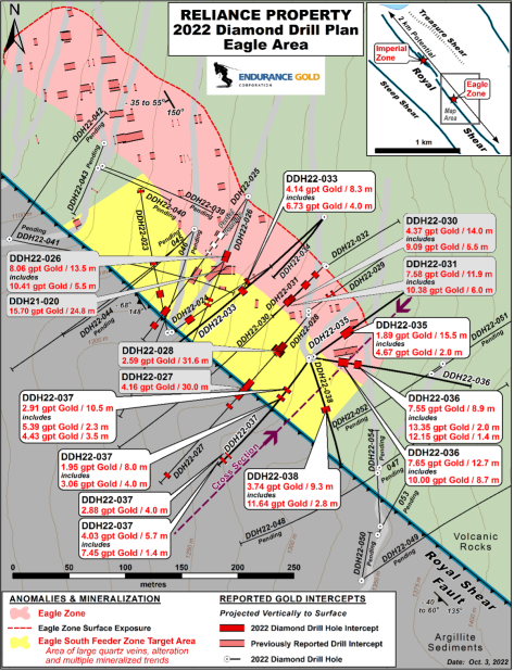 The location of the thirty-three (33) diamond drill holes completed to date in 2022 is shown in Figure 1. An interpretation of the geology and gold zone locations for DDH22-035 through DDH22-038 is shown on a cross-section Figure 2. The 2022 diamond drill assay results reported in this release are summarized in Table 1 below. Previously reported 2022 diamond drill intersections are completely summarized in the news release of September 6, 2022. A schematic geological interpretation of the Eagle Area is available on the Company website in the maps section. The complete tabulation of previous RC and 2021 diamond drill results are summarized on the Company website.