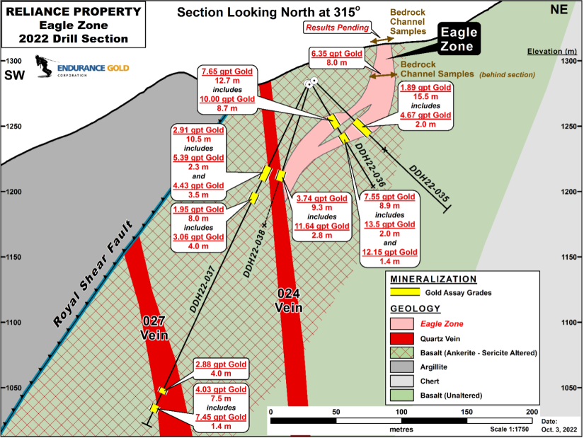 “We now have assay results from thirty-eight diamond drill holes completed in 2021 and 2022 with seventy-eight percent of these drill holes returning significant gold intersections.” commented Robert T. Boyd, CEO of Endurance Gold. “The ongoing drilling program has delineated the Eagle Zone over a 500 metre strike extent and has discovered large brecciated quartz veins signifying a robust orogenic gold system with depth potential. Future drilling will continue to expand the Eagle Zone and delineate mineralized feeder zones related to the quartz veins.”