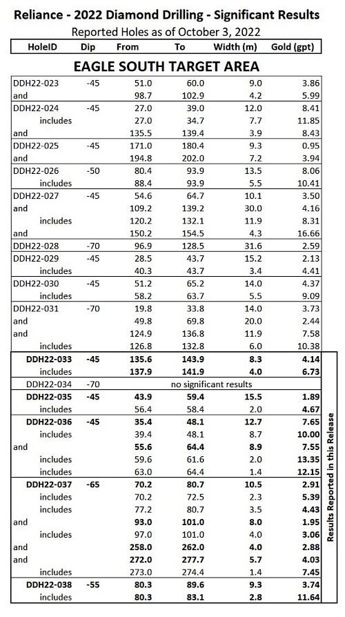 Assay results reported herein include nine (9) significant gold intersections from five (5) additional diamond drill holes completed in the Eagle Area. The prime objectives of the 2022 diamond drilling program are to extend the strike of the mineralized system and to test the extent of mineralized feeder structures below the shallow-dipping, near-surface Eagle Zone. Highlights of the drilling results include: