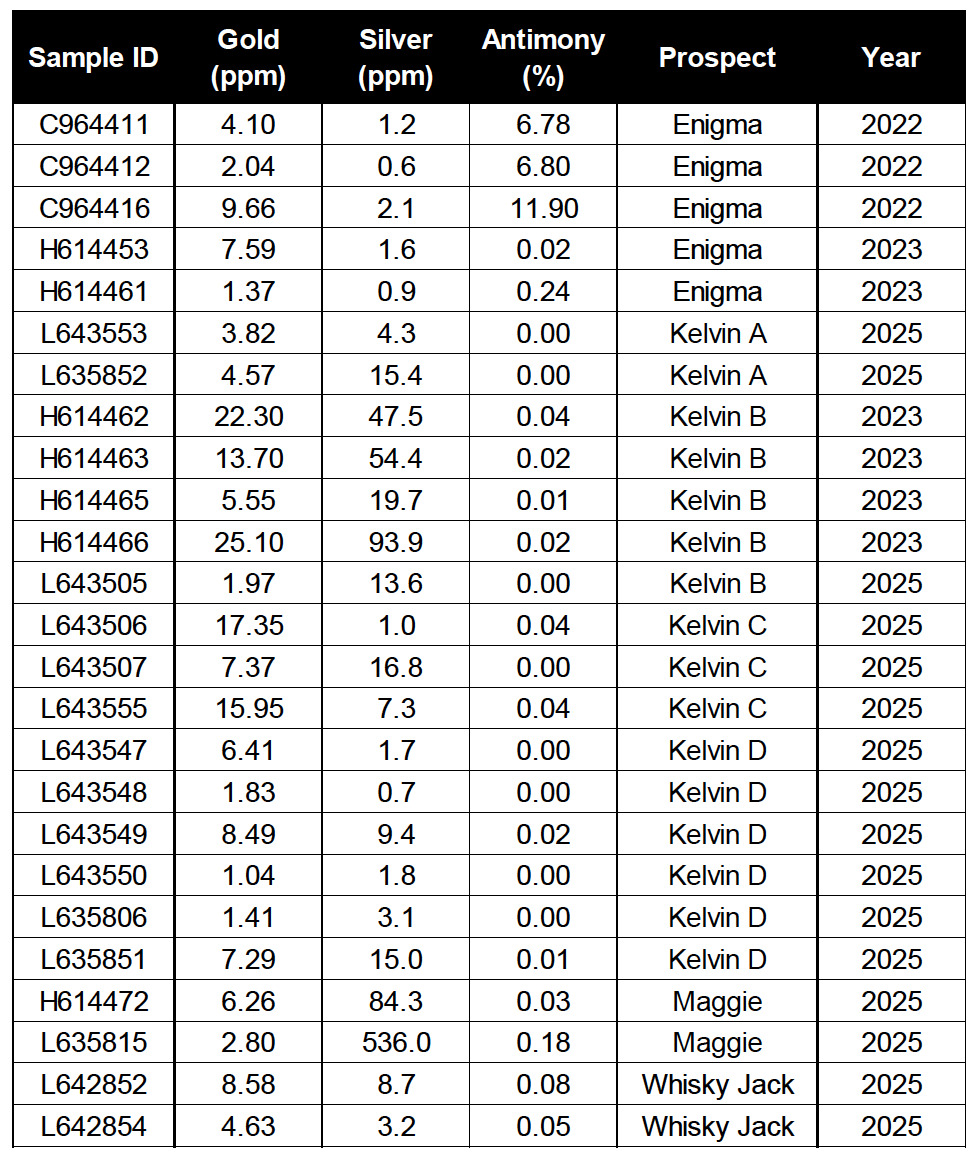 - Whisky Jack is located 1,200 m southeast of the Enigma prospect which previously returned grab samples up to 9.66 gpt gold and 11.90% antimony from quartz-stibnite veins hosted in a wide ankerite-altered shear zone.