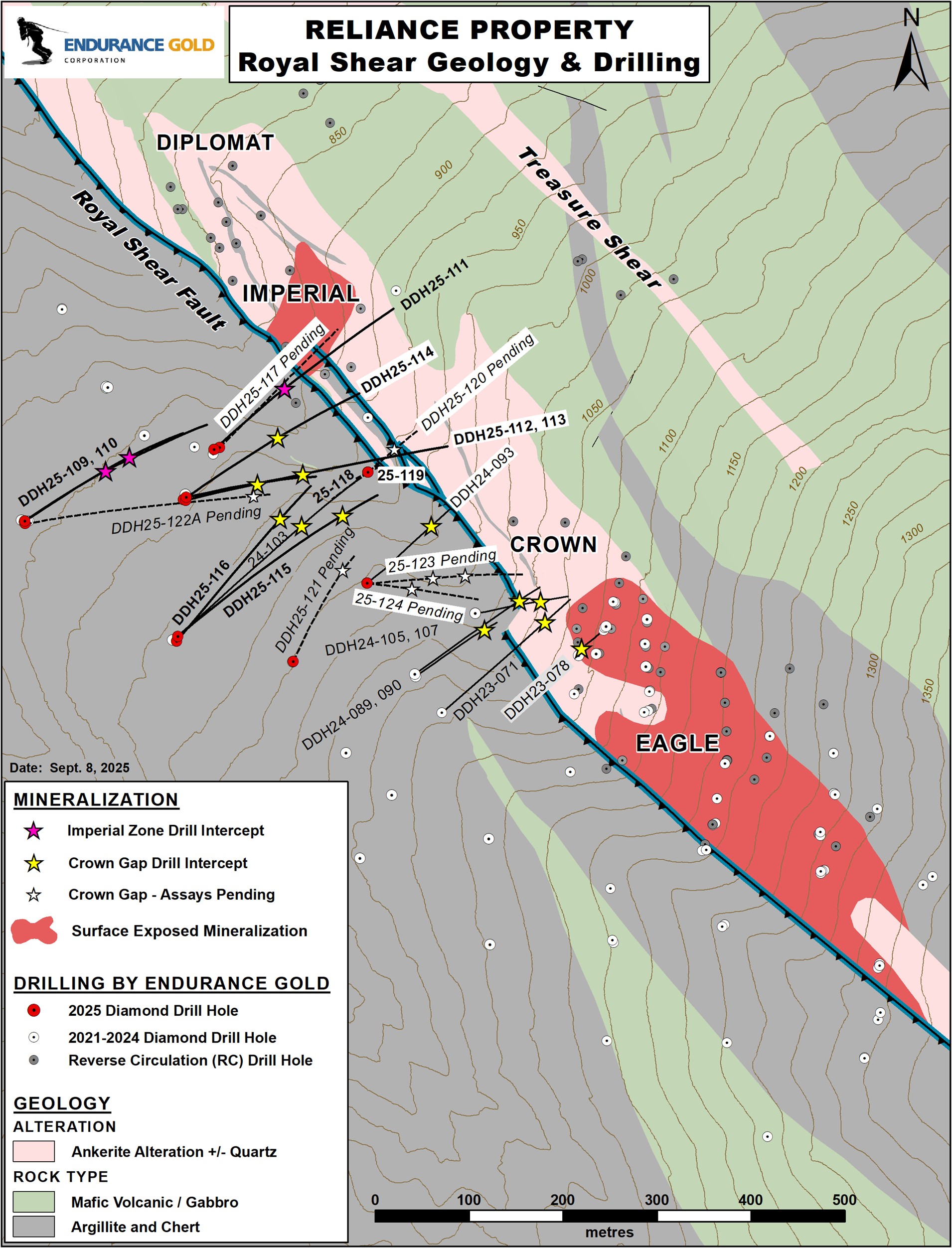 “Testing of the Crown Gap is demonstrating potential for a wider shallow plunging portion of Royal Shear mineralized trend that is continuous between Imperial and the Lower Crown target areas and open to expansion along the plunge trend and at depth” stated Robert T. Boyd, President & CEO of Endurance Gold Corporation. “In this area we have also intersected a significant antimony enriched portion of the Royal Shear with several higher grade antimony intersections including previously reported DDH25-113 that returned the best grade over width for antimony to date at Reliance.”