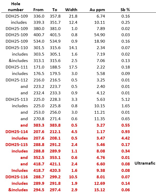 - Hole DDH25-114 returned 1.17 gpt gold over 4.5 m, including an antimony-rich vein that returned 3.47 gpt gold and 4.4% antimony over 0.5 m. Management is encouraged by this initial drill hole and will design further holes to test this 150 m undrilled gap.