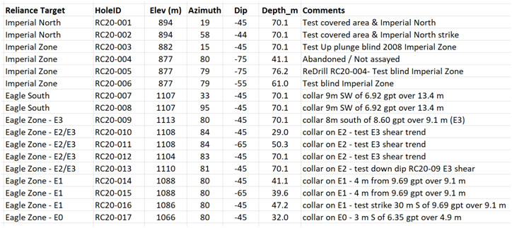 Eagle South Zone -- The furthest south exposure of the Royal Shear. As reported on October 15, 2020 channel sampling from outcrop returned 8.9 grams per tonne (“gpt”) gold over 9.6 m within a wider mineralized zone of 6.92 gpt gold over 13.4 m. RC20-007 and RC20-008 are minus 45 degree inclined drill holes of 70.1 m each and were drilled from the same collar location to test this target. The objective of these holes was to determine the dip and strike extent of the mineralized shear discovered at surface. The collar was located 9 m southwest of the south end of the channel-sampled outcrop.