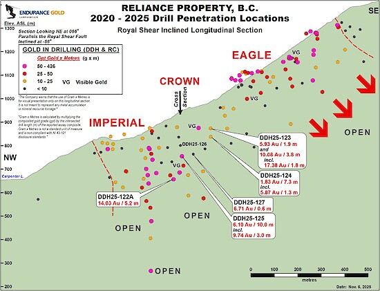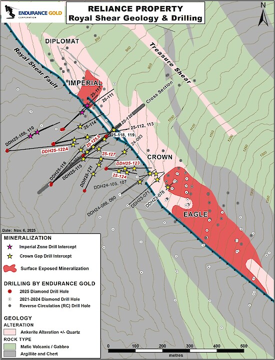 The 2025 drilling program was designed to test the Crown “Gap”, a previously insufficiently drilled section of the Royal Shear connecting the Imperial and Eagle Zones. The program was successful in achieving encouraging intersection statistics within the Crown Gap with 13 drill holes intersecting greater than 10 gram*metres. Several of the 2025 holes returned multiple gold interceptions. The intersection statistics in the Crown Gap are consistent with prior high success statistics at the Eagle and Imperial Zones.