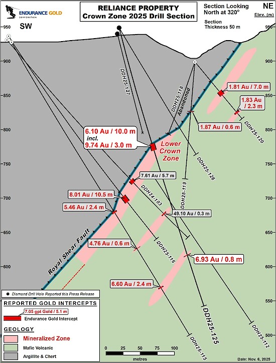 Endurance Gold Corporation (EDG – TSX.V; ENDGF – OTCQB; 3EG – Berlin Open Market) (the “Company”) is pleased to announce assay results from six (6) additional drill holes from the Crown Zone at its 100%-owned Reliance Gold Project (the “Project”). Four (4) drill holes tested the Lower Crown target while two (2) drill holes tested the Upper Crown target, both 2024 drill discoveries. The Company also provides a Project update regarding the inaugural Mineral Resource Estimate, metallurgical testing, and new target generation. Highlights include: