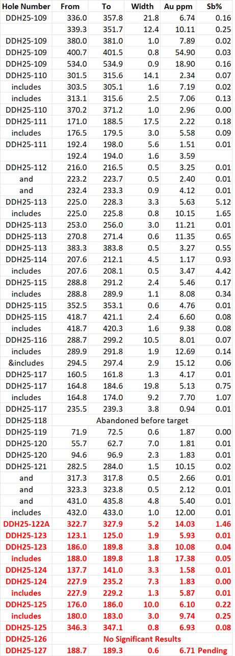 - Drill hole DDH25-122A returned 14.03 grams per tonne (“gpt”) gold & 1.46% antimony (“Sb”) over 5.2 metres (“m”) where it successfully intersected the mineralized Royal Shear structure along strike between the Lower Crown and Imperial Zones. This hole was a 30 m step-out from Lower Crown hole DDH25-113 that returned 5.63 gpt gold over 3.3 m (see press release July 29, 2025), and an 85 m step-out southeast from Imperial Zone.