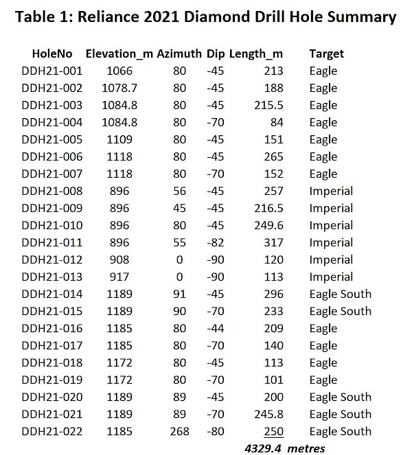 The Company’s has now completed a total of 4,329 metres (“m”) with a total of twenty-two (22) diamond drill holes at the Eagle and Imperial Zones. This final meterage exceeds the planned 4,000 m program announced in August 2021.
