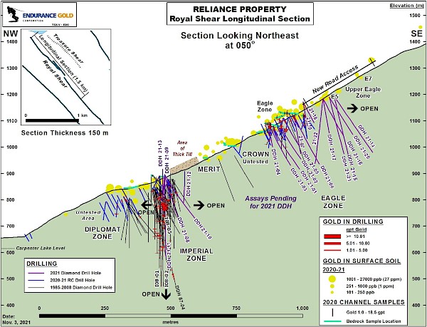Endurance Gold Corporation (EDG – TSX.V) (the “Company”) is pleased to report an update on the diamond drilling program at the Reliance Gold Property (the “Property”) in southern British Columbia. The Property is located 4 kilometres (“km”) east of the village of Gold Bridge with year-round road access, and 10 km north of the historic Bralorne-Pioneer Gold Mining Camp which has produced over 4 million ounces of gold.