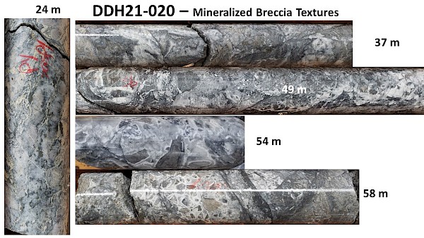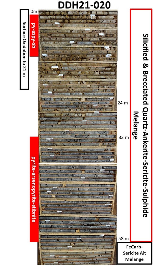 Eagle South Target –Five holes in the current program tested this target which immediately adjoins the Eagle Zone. On surface this consists of a 50 to 100 m wide ankerite-sericite-sulphide alteration zone within a melange of intensely altered volcanics, sediments and possibly chert (see press release of October 28, 2021). In diamond drill core extensive sulphide mineralized quartz breccia is observed and interpreted to be either chert or an early pervasive silicification event that has been subject to brittle deformation with later sulphide introduction into the breccia matrix. Some more restricted portions of these quartz-breccia zones have arsenopyrite and/or stibnite as a sulphide component over widths of up to 25 m. The estimated true width and dip of the observed quartz breccia in this area has not yet been determined. A photographic compilation of a wide sulphide altered interval and selected highlights of the breccia textures from DDH21-20 is appended below as Figure 3 and Figure 4. There has been no drill testing of the Upper Eagle target during the current drill program.