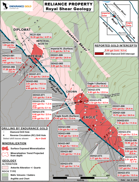 Endurance Gold Corporation (EDG – TSX.V; ENDGF – OTC Pink; 3EG – Berlin Open Market) (the “Company”) is pleased to announce the final set of 2023 drilling results from the Eagle and Crown Zones at its Reliance Gold Project (the “Property”). The Property is road accessible and located 4 kilometres (“km”) east of the village of Gold Bridge, and 10 km north of the historic Bralorne-Pioneer Gold Mining Camp which has produced over 4 million ounces of gold.