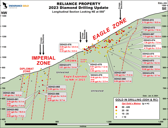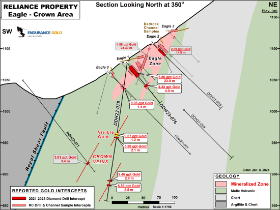 “We are pleased to see that drill testing of the Eagle Zone continues to deliver high quality wide drill intersections and remains open at depth and to the south, 550 m from todays best reported intersection.” stated Robert T. Boyd CEO of Endurance Gold Corporation “The cluster of visible gold specks in the Crown drill intercept also provides encouragement about the evolving potential at depth at Reliance.”