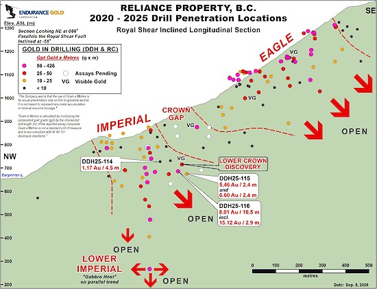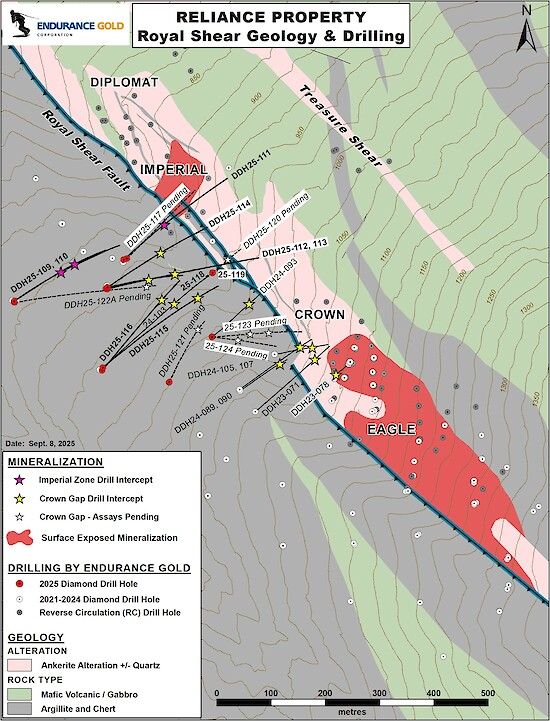 “Testing of the Crown Gap is demonstrating potential for a wider shallow plunging portion of Royal Shear mineralized trend that is continuous between Imperial and the Lower Crown target areas and open to expansion along the plunge trend and at depth” stated Robert T. Boyd, President & CEO of Endurance Gold Corporation. “In this area we have also intersected a significant antimony enriched portion of the Royal Shear with several higher grade antimony intersections including previously reported DDH25-113 that returned the best grade over width for antimony to date at Reliance.”
