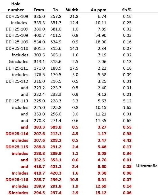 - Hole DDH25-114 returned 1.17 gpt gold over 4.5 m, including an antimony-rich vein that returned 3.47 gpt gold and 4.4% antimony over 0.5 m. Management is encouraged by this initial drill hole and will design further holes to test this 150 m undrilled gap.