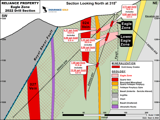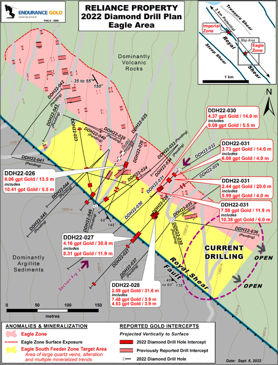 - DDH22-030 also successfully intersected the 25 m wide 024 Vein and the 35 m wide 027 Vein within the Eagle South Zone. Both veins have associated anomalous gold mineralization on this section. 70 m to the west of the 024 Vein intersection, a mineralized breccia returned 8.41 gpt gold over 12.0 m from DDH22-024 along the western margin of the 024 Vein (see News Release July 18, 2022). 70 m to the southeast of the 027 Vein intersection, a mineralized breccia on the eastern margin of the 027 Vein returned 4.16 gpt gold over 30 m including 8.31 gpt gold over 11.9 m from DDH22-027 ( see News Release August 8, 2022). The northwest trending 024 and 027 veins consist of crackle-brecciated quartz veins which are high priority feeder structure targets in the ongoing drill program.