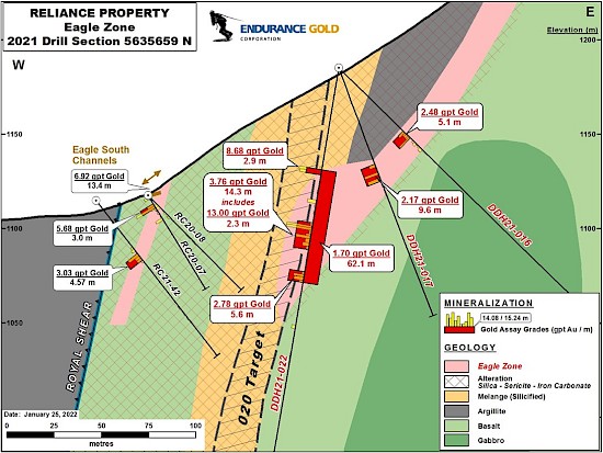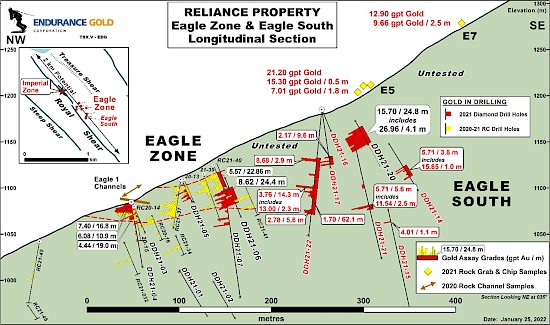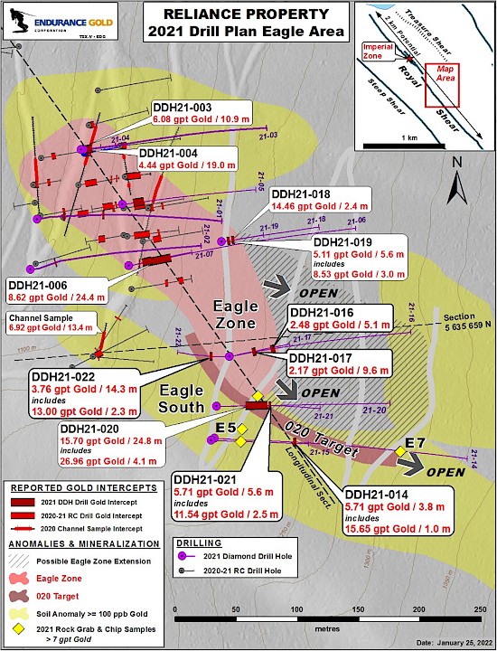 “Our maiden 2021 diamond drilling program at Reliance was very successful with 16 of our 22 drill holes returning significant gold intersections and four of these drill holes returning gold intersections exceeding 100 gram-metres”, commented Robert T. Boyd, CEO of Endurance Gold. “This is an excellent success percentage for a maiden drilling program on an Orogenic gold system. These four top quality holes are distributed amongst three strong gold-bearing zones over 750 metres of trend along the Royal Shear. Additional holes reported today, together with drill hole DDH21-020 which returned the best intersection to date of 15.7 grams per tonne gold over 24.8 metres, collectively confirm a newly recognized steeply dipping structural target at Eagle South that will need to be followed up aggressively with drilling.”