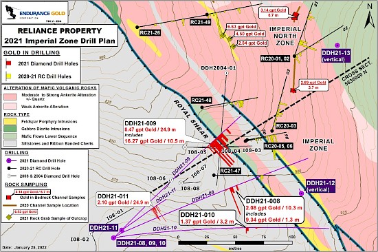 - The Imperial Zone is interpreted to be a west plunging steeply dipping mineralized shoot located in the footwall of the Royal Shear and not exposed on surface. The mineralized shoot was confirmed down dip by previously reported holes DDH21-009 (8.47 gpt gold over 24.9 m) and confirmed further down-dip by hole DDH21-011 (2.10 gpt gold over 24.9 m) indicating a minimum 200 m depth potential to the Imperial Zone.